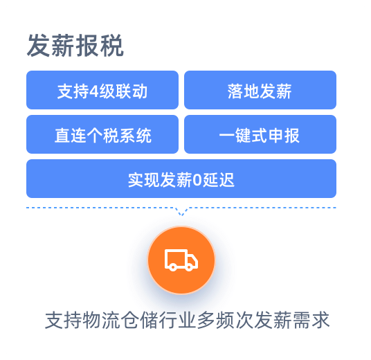 支持4级联动,完成落地发薪,直连个税系统,完成一键式申报,实现发薪0延迟,支持物流仓储行业多频次发薪需求。